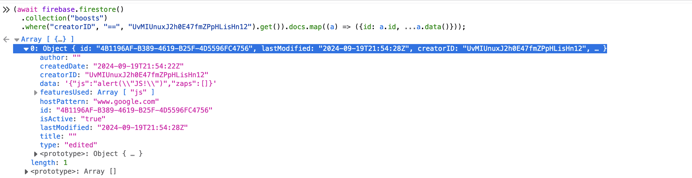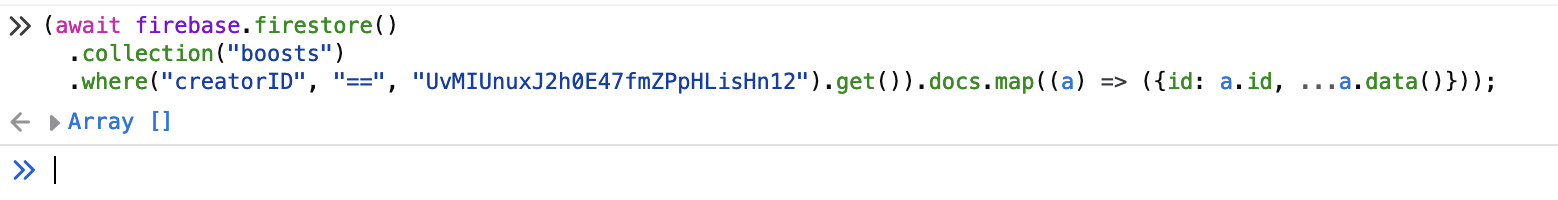 do you see where this is going?, so, i manually logged into my account using my dummy page to test firebase accounts, and executed the exact same query to get my boosts: